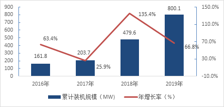 圖1:中國已投運光儲項目的累計裝機規(guī)模(2016-2019年)
