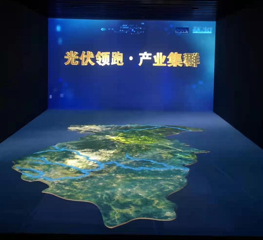 該區(qū)域?yàn)?2臺投影機(jī)投射出的L型裸眼3D沙盤,展出了,鐵路和公路交通圖,礦產(chǎn)區(qū)域分布情況;以及“光伏領(lǐng)跑 綠色發(fā)展”主題影片,一同感受陽泉光伏領(lǐng)跑者示范基地一路走來的光輝歷程。