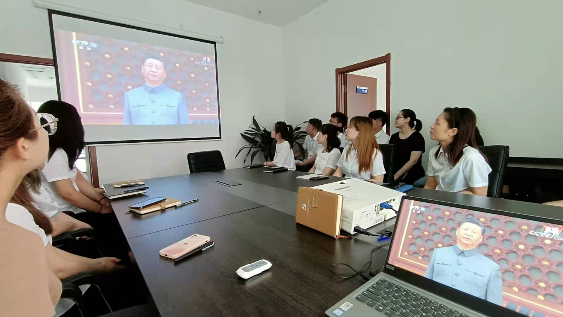 通過大屏幕,看到習(xí)近平同黨和國家領(lǐng)導(dǎo)人登上天安門城樓主席臺(tái),看到天安門廣場(chǎng)人頭攢動(dòng)時(shí),大家目不轉(zhuǎn)睛、聚精會(huì)神、認(rèn)真收看。電視直播期間,認(rèn)真聆聽習(xí)近平總書記的重要講話,邊看邊記筆記,總書記振奮人心的講話,會(huì)議室不時(shí)響起掌聲。一小時(shí)四十分鐘的直播,大家始終沉浸在熱烈莊重、恢宏磅礴的慶祝氛圍之中。大家紛紛認(rèn)為,百年恰是風(fēng)華正茂,未來仍需風(fēng)雨兼程,站在新的歷史起點(diǎn)上,更須不忘初心,砥礪前行。
